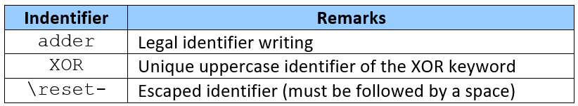 - Can use any ASCII character by adding a backslash (“ \ “) at the beginning of the Identifier and ending with a space.