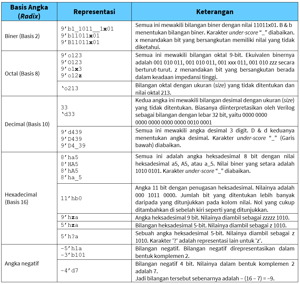 Dalam pemrograman Verilog, angka dapat ditentukan dalam bentuk bilangan biner (basis 2) , oktal (basis 8), desimal (basis 10), atau heksadesimal (basis 16). Representasi angka yang direkomendasikan dalam pemrograman Verilog memiliki tiga unsur utama, yaitu ukuran (Size), radix/basis, dan nilai angkai (Value). Apabila ada kebutuhan untuk desain sistem digital tertentu, representasi angka ini dapat ditambahkan dengan tanda negatif (“ – “) di depan unsur ukuran (Size) yang menjadikan angka tersebut menjadi angka bertanda (Signed number), namun hal ini hanya bersifat opsional. Gambar 1 menunjukkan format representasi angka yang direkomendasikan dalam pemrograman Verilog dengan setiap unsur penyusunnya dijelaskan secara terpisah.
