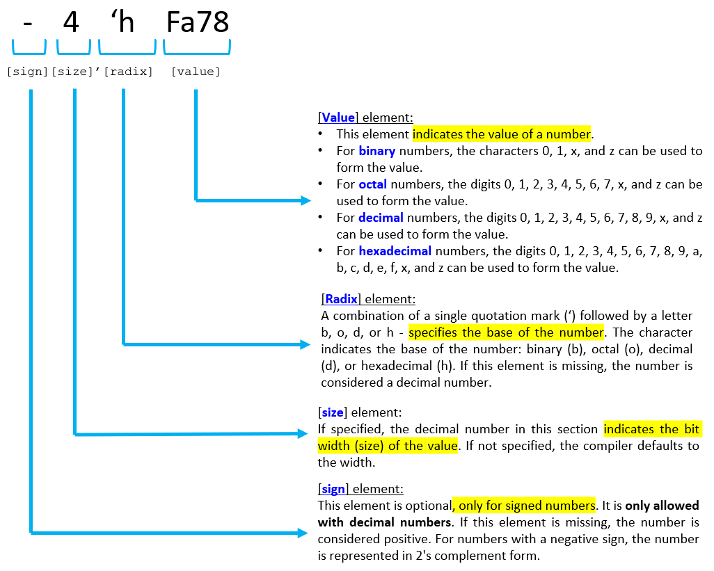 In Verilog programming, numbers can be specified in binary (base 2), octal (base 8), decimal (base 10), or hexadecimal (base 16) form. The recommended number representation in Verilog programming has three main elements, namely size, radix/base, and value. If there is a need for a particular digital system design, this number representation can be added with a negative sign (“-“) in front of the size element to make the number a signed number, but this is only optional. Figure 1 shows the recommended number representation format in Verilog programming with each component explained separately.