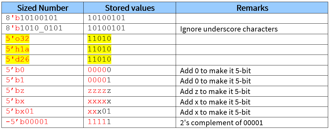 Specify the number or width of bits explicitly. Some examples of sized numbers can be seen in Table 1.