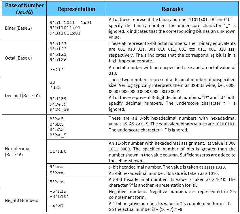 Verilog uses several number bases (also called “Radix”) to represent numeric values in digital system design, including: