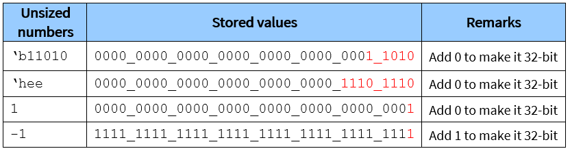 Do not specify the number or bit width explicitly. Some examples of unsized numbers can be seen in Table 2.
