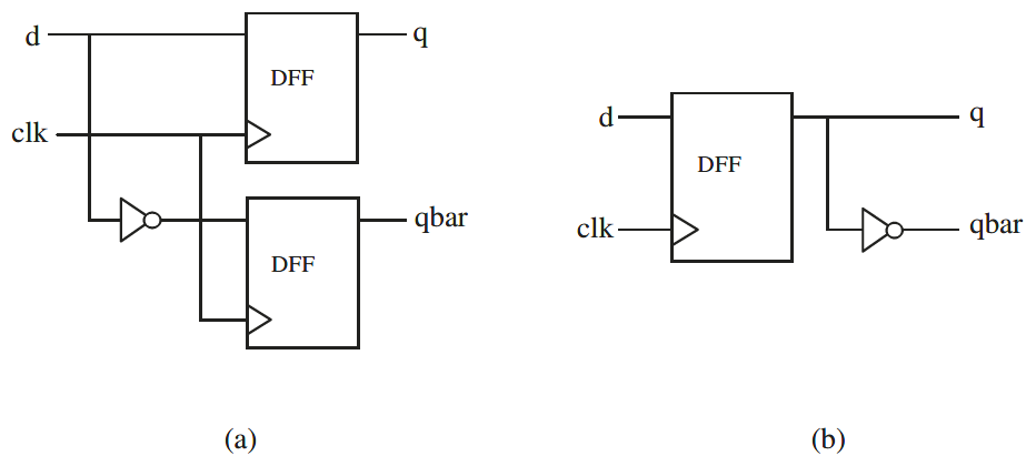 Gambar 10. Rangkaian DFF yang disimpulkan dari kode contoh 11.6: (a) Solusi 1, (b) Solusi 2.