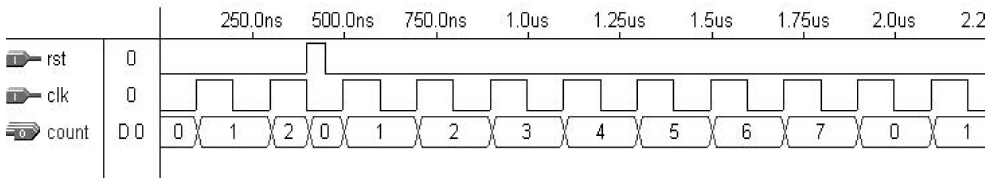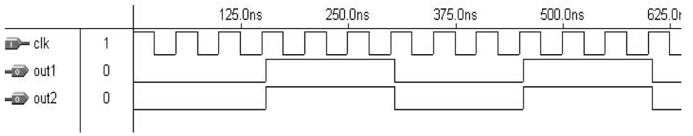 Dalam contoh ini, kami ingin mengimplementasikan rangkaian yang membagi frekuensi clock dengan 6 (Gambar 8). Sengaja, kami mengimplementasikan dua keluaran, satu berdasarkan SIGNAL (count1) dan yang lainnya berdasarkan VARIABLE (count2). Setelah mengetahui bahwa keduanya berfungsi dengan baik, lihat hasil simulasi pada Gambar 9.