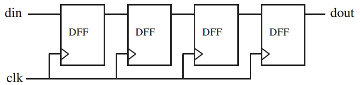 Sekarang kita tertarik untuk memeriksa apa yang terjadi pada shift register 4-stage pada gambar 13 ketika penugasan VARIABLE dan SIGNAL yang berbeda dilakukan. Tentu saja, jika solusinya benar, maka sinyal keluaran (dout) seharusnya empat clock tepi positif di belakang sinyal masukan (din).