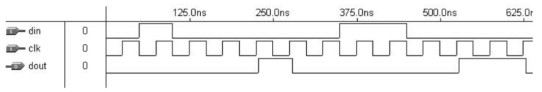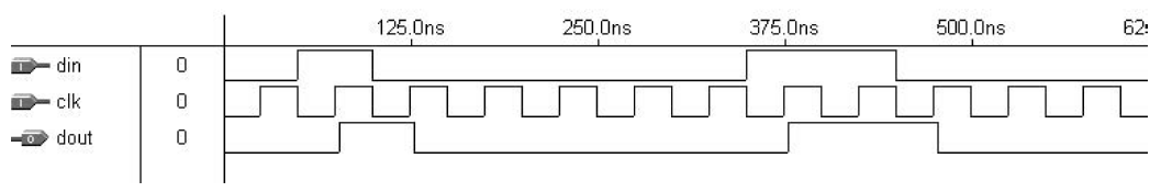 Dari hasil simulasi, maka seperti yang diharapkan, “dout” tertinggal empat clock tepi positif di belakang “din” pada kasus pertama, tetapi hanya satu tepi positif di belakang input pada kasus kedua.
