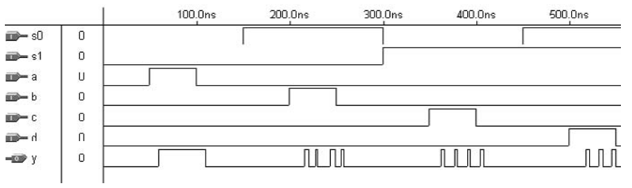 Hasil simulasi dari kedua solusi ditunjukkan pada Gambar 3 adalah grafik berbasis waktu (time) untuk multiplexer (mux) yang buruk. Sedangkan Gambar 4 adalah grafik berbasis waktu untuk multiplexer yang baik. Sehingga dapat disimpulkan bahwa solusi 2 yang berfungsi dengan baik.