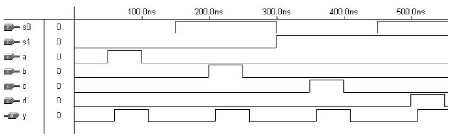 Mari kita pertimbangkan kembali masalah pada contoh 11.1. Satu-satunya perbedaan dalam solusi di bawah ini adalah penggunaan VARIABLE internal, bukan SIGNAL. Karena pembaruan variabel bersifat langsung, nilai awal ditetapkan dengan benar dan tidak akan ada keluhan mengenai penugasan ganda yang dikeluarkan oleh kompilator. Hasil simulasi dapat diverifikasi pada Gambar 1.