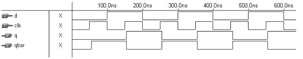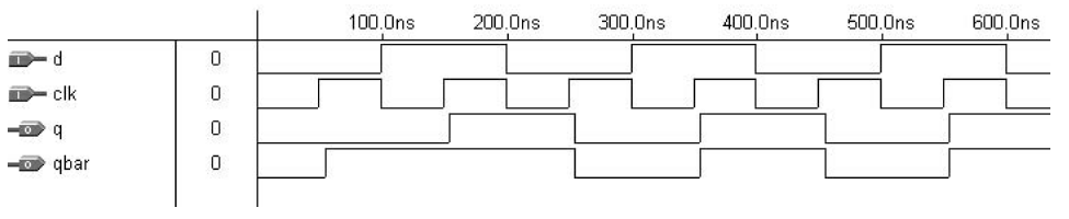 Program 8: Untuk contoh 11.6 – DFF dengan output q dan qbar – Solusi 1 (Dengan 2 D Flip-Flop)