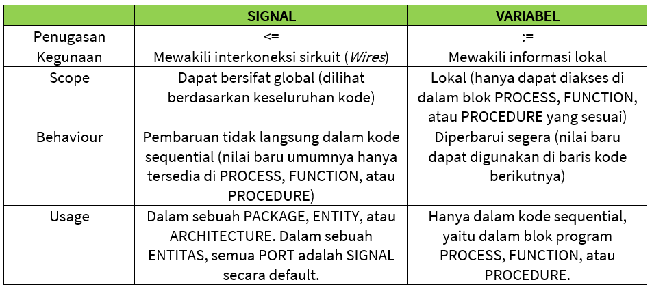 Sahabat Robonesia, pemrograman VHDL menyediakan dua objek untuk menangani nilai data non-statis, yaitu SIGNAL dan VARIABLE. Pemrograman VHDL juga menyediakan cara untuk menetapkan nilai default (statis), yaitu CONSTANT dan GENERIC.