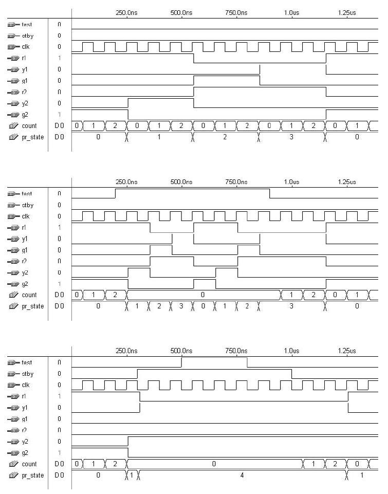 Hasil simulasi ditunjukkan pada gambar 11. Agar hasilnya sesuai dengan grafik, kita menggunakan nilai waktu yang kecil, dengan semua CONSTANTS sama dengan 3 kecuali timeTEST, yang dibuat sama dengan 1. Oleh karena itu, sistem diharapkan mengubah keadaan setiap tiga siklus clock saat dalam operasi Reguler, atau setiap siklus clock jika dalam mode Uji. Kedua kasus ini dapat diamati pada dua grafik pertama gambar 11, masing-masing. Grafik ketiga menunjukkan mode Standby diaktifkan. Seperti yang diharapkan, stby bersifat asinkron dan memiliki prioritas lebih tinggi daripada test, menyebabkan sistem tetap berada dalam keadaan YY (keadaan 4) saat stby aktif. Sinyal uji, di sisi lain, bersifat sinkron, tetapi tidak perlu menunggu hingga pengaturan waktu status saat ini selesai untuk diaktifkan, seperti yang dapat diamati pada grafik kedua.