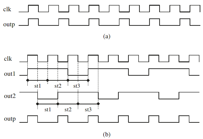 Untuk mengatasi aspek two-edge, salah satu alternatifnya adalah dengan mengimplementasikan dua state machine, mesin keadaan pertama beroperasi secara eksklusif pada transisi positif clk dan mesin keadaan kedua beroperasi secara eksklusif pada Edge-negatve, sehingga menghasilkan sinyal perantara out1 dan out2 yang ditunjukkan pada gambar 12(b). Sinyal-sinyal ini kemudian dapat di-AND-kan untuk menghasilkan sinyal outp yang diinginkan. Perhatikan bahwa rangkaian ini tidak memiliki input eksternal (kecuali clk, tentu saja), sehingga output hanya dapat berubah ketika clk berubah (output sinkron).