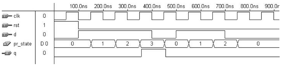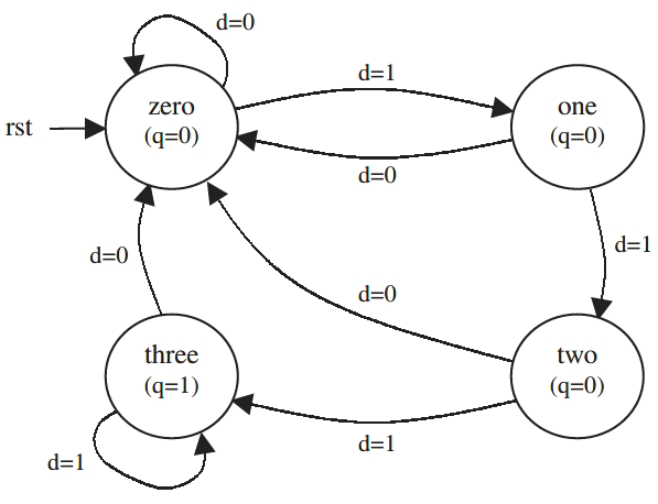 Perhatikan bahwa dalam contoh ini, output tidak bergantung pada input saat ini. Fakta ini dapat diamati pada baris 30, 35, 40, dan 45 dari kode di atas, yang menunjukkan bahwa semua penugasan ke q bersifat tanpa syarat (yaitu, tidak bergantung pada d). Oleh karena itu, output secara otomatis sinkron (mesin Moore), sehingga penggunaan desain Style #2 tidak diperlukan. Rangkaian ini membutuhkan dua flip-flop, yang mengkodekan empat keadaan mesin keadaan, dari mana q dihitung.