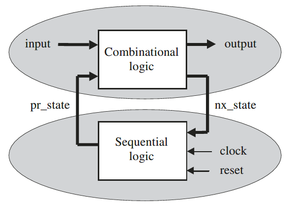 Bagian logika kombinasional (atas) memiliki dua input, yaitu pr_state (Present_state/keadaan saat ini) dan input eksternal. Bagian ini memiliki dua output, yaitu nx_state (Next_state/keadaan berikutnya) dan output eksternal.