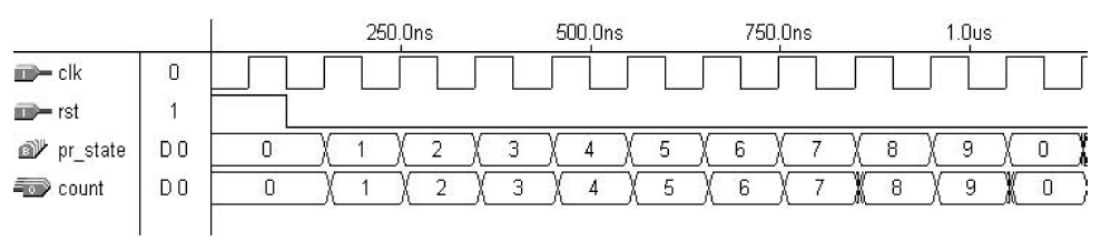 Kode program VHDL, yang secara langsung menyerupai template desain style #1, disajikan pada Program 1. Tipe data yang dihitung (State) muncul pada baris 11–12. Desain bagian bawah (Clock) disajikan pada baris 16–23, dan bagian atas (kombinasi) pada baris 25–59. Dalam contoh ini, jumlah register adalah [log2 10] = 4. Hasil simulasi ditunjukkan pada gambar 3. Seperti yang dapat dilihat, output (Count) bertambah dari 0 menjadi 9, dan kemudian dimulai kembali dari 0.