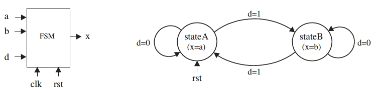 Gambar 4 menunjukkan diagram keadaan dari FSM yang sangat sederhana. Sistem ini memiliki dua keadaan (keadaan A dan keadaan B), dan harus berubah dari satu ke yang lain setiap kali d = ‘1’ diterima. Keluaran yang diinginkan adalah x = a ketika mesin berada di keadaan A, atau x = b ketika berada di keadaan B. Keadaan awal (reset) adalah keadaan A. Kode VHDL untuk rangkaian ini, menggunakan desain Style #1, ditunjukkan di bawah ini.