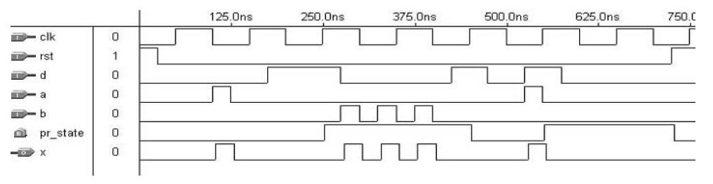 Hasil simulasi yang berkaitan dengan kode di atas ditunjukkan pada gambar 5. Perhatikan bahwa rangkaian bekerja seperti yang diharapkan. Memang, dengan melihat file laporan, kita akan memverifikasi bahwa, seperti yang diharapkan, hanya satu flip-flop yang diperlukan untuk mengimplementasikan rangkaian ini karena hanya ada dua keadaan yang akan dikodekan. Perhatikan juga bahwa bagian atas memang kombinasional, karena output (x), yang dalam hal ini bergantung pada input (a atau b, tergantung pada keadaan mesin), bervariasi ketika a atau b bervariasi, terlepas dari clk. Jika output sinkron diperlukan, maka desain Style #2 harus digunakan.