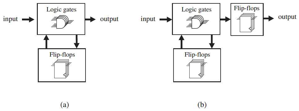 Seperti yang telah kita lihat, pada desain Style #1 hanya pr_state yang disimpan. Oleh karena itu, keseluruhan rangkaian dapat diringkas seperti pada gambar 6(a). Perhatikan bahwa dalam kasus ini, jika itu adalah mesin Mealy (mesin yang outputnya bergantung pada input saat ini), output mungkin berubah ketika input berubah (output asinkron).