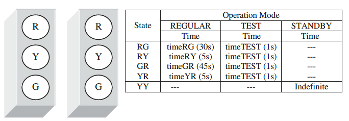 - Mode Standby: jika diatur (misalnya, oleh sensor yang mendeteksi kerusakan, atau sakelar manual) sistem harus mengaktifkan lampu kuning di kedua arah dan tetap demikian selama sinyal siaga aktif.