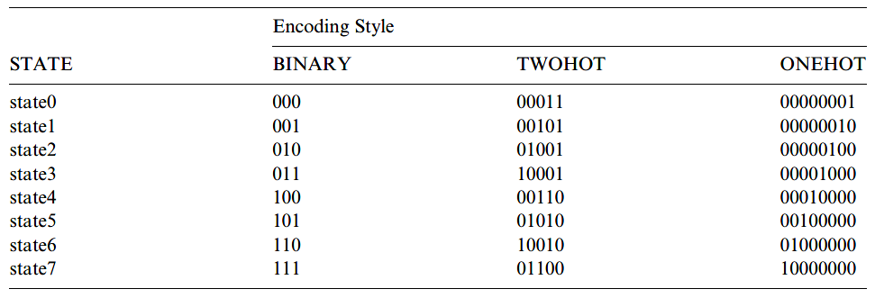 Sebagai contoh, misalkan mesin keadaan kita memiliki delapan keadaan. Maka pengkodeannya akan seperti yang ditunjukkan pada tabel 2. Jumlah flip-flop yang dibutuhkan dalam setiap kasus adalah tiga (untuk biner), lima (twohot), atau delapan (onehot). Detail lainnya juga disajikan dalam tabel 2.