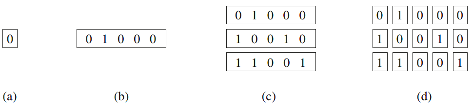 Misalkan kita ingin membangun array yang berisi empat vektor, masing-masing berukuran delapan bit. Ini kemudian menjadi array 1Dx1D (lihat gambar 1). Mari kita sebut setiap vektor dengan baris, dan array lengkap dengan matriks. Selain itu, misalkan kita ingin bit paling kiri dari setiap vektor menjadi MSB (most significant bit), dan kita ingin baris teratas menjadi baris 0. Maka implementasi array-nya adalah sebagai berikut.