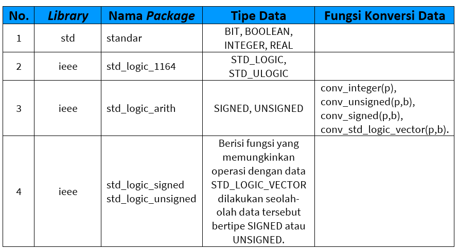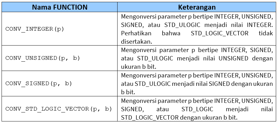 Beberapa fungsi konversi data dapat ditemukan di dalam paket std_logic_arith dari library IEEE. Fungsi-fungsi tersebut adalah: