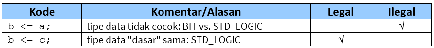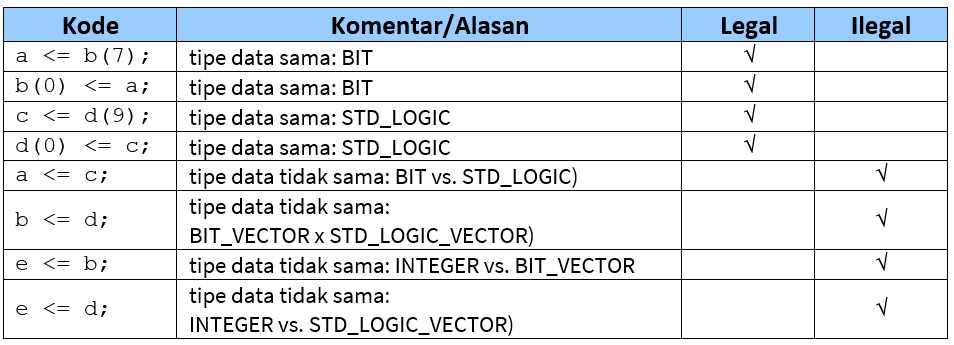 Berdasarkan sinyal-sinyal di atas, maka penugasan-penugasan berikut ini akan sah (legal) untuk menetapkan suatu nilai pada suatu sinyal, operator ‘‘<=’’ harus digunakan: