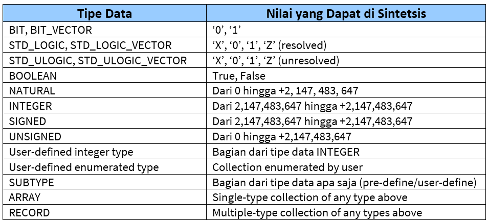 BIT, STD_LOGIC, STD_ULOGIC, dan BOOLEAN.