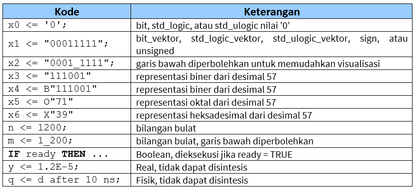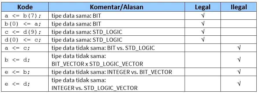 Berdasarkan sinyal-sinyal di atas, maka penugasan-penugasan berikut ini akan sah (legal) untuk menetapkan suatu nilai pada suatu sinyal, operator ‘‘<=’’ harus digunakan: