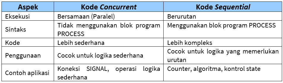 Kode concurrent adalah kode yang dieksekusi secara paralel, artinya semua pernyataan dalam blok concurrent dijalankan pada waktu yang sama. Ini merupakan default dalam VHDL dan menggambarkan perilaku hardware yang sesuai dengan sifat paralelisasi sirkuit digital.